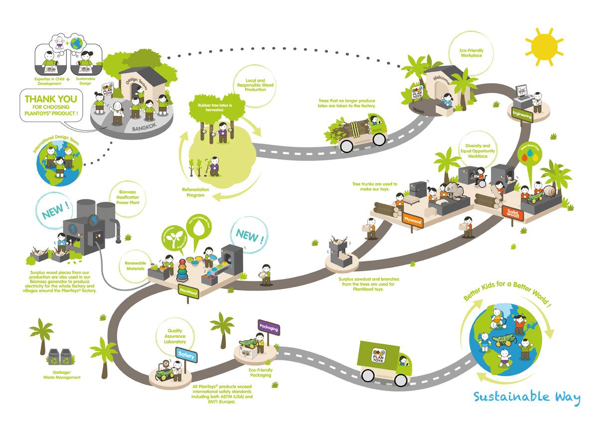 Wir sind vom Konzept von PlanToys überzeugt, da absolut nachhaltig und umweltorientiert produziert wird. Auf eigenen Gummibaumplantagen wird zuerst Naturkautschuk gewonnen. Nach ein paar Jahren produzieren die Bäume kein Kautschuk mehr. Jetzt beginnt ihr zweites Leben als Rohstoff für die Spielzeugproduktion. Das Stammholz wird direkt zu Spielzeug verarbeitet. Ein Teil der Wurzeln und andere Teile des Baumes werden für die Energiegewinnung im firmeneigenen Kraftwerk genutzt. Die Energie wird für die Herstellung der Spielwaren genutzt. Überschüssige Energie wird an die umliegenden Dörfer geliefert.